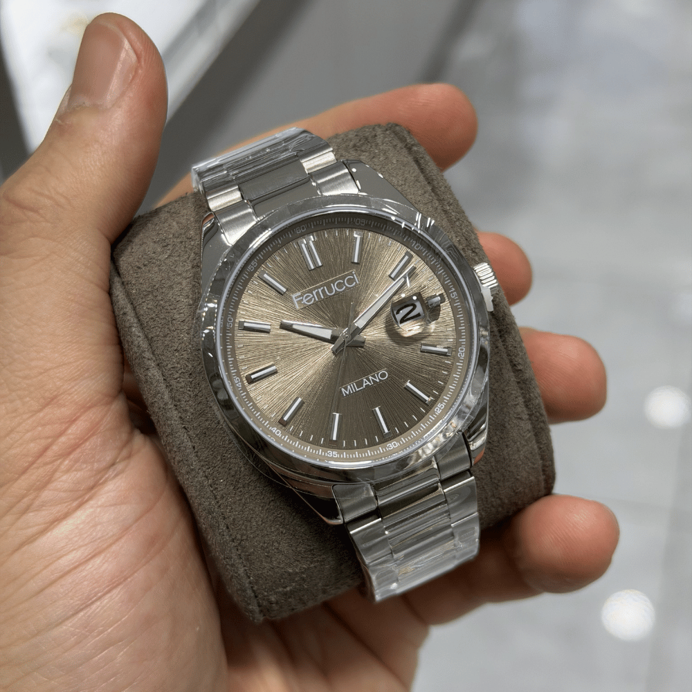 Ferrucci imzası taşıyan bu erkek kol saati modern görünümü ile tamamlayıcı bir aksesuardır. 43 mm yuvarlak metalik gri çelik kasa, metalik gri çelik kordon ve siyah kadran ile öne çıkan model mineral cam, analog ekran tipi ve pilli mekanizma sayesinde kullanışlı bir deneyim sunar. 3 ATM su geçirmezlik ve takvim fonksiyonu ile aktif kullanıma uyum gösterir.