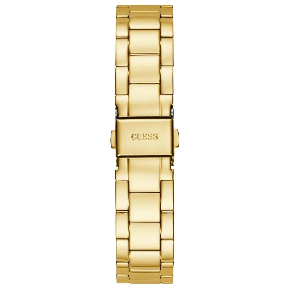 Guess Luna, sportif ve zarif tasarımıyla gün boyu şıklığınızı tamamlıyor! 36 mm çelik altın rengi yuvarlak kasası, dayanıklı mineral camı ve sade beyaz kadranı ile minimalizmi ve lüksü bir araya getiriyor.