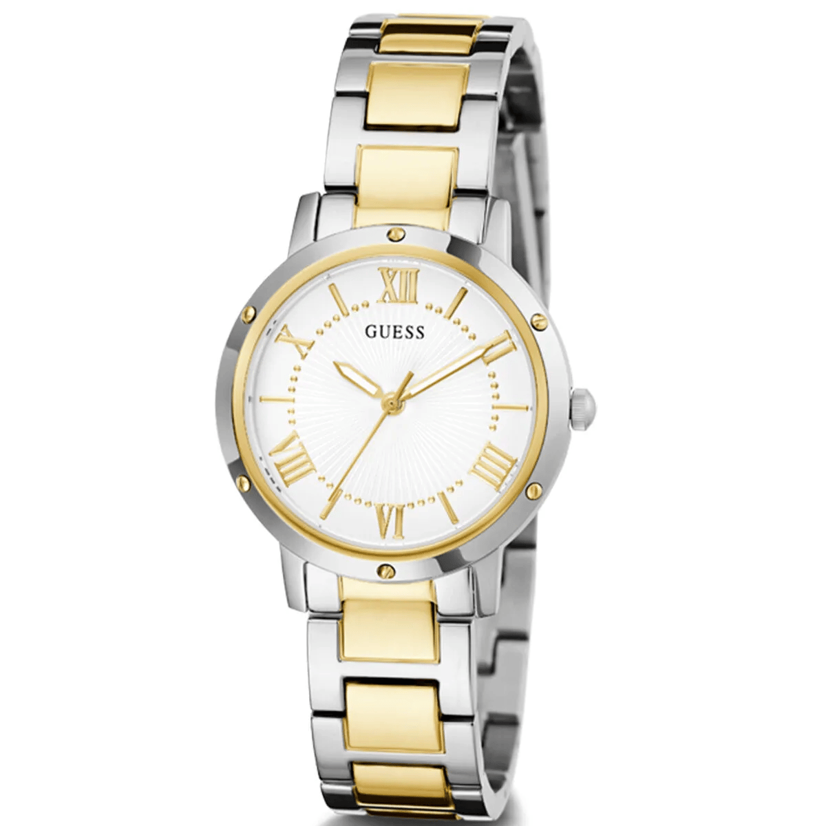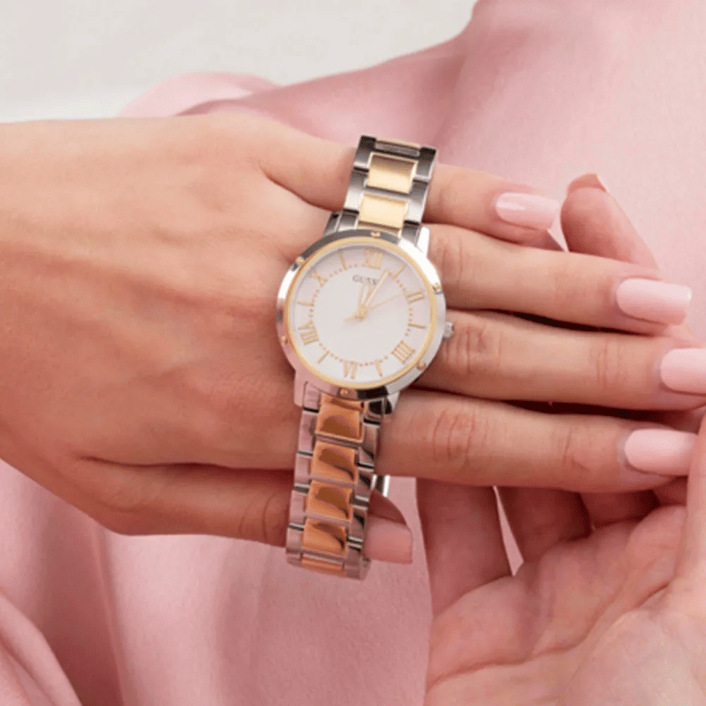 Guess Dawn kadın kol saati, klasik şıklığı modern detaylarla birleştirerek zamansız bir stil sunar. Ağırlık: 90.5 gr olan bu model, hassas Quartz mekanizması ve 2 yıl garanti süresiyle uzun ömürlü bir kullanım sağlar. Kasa, 34 mm çapında, 7 mm kalınlığında, çelik materyalden üretilmiş, yuvarlak formda ve metalik gri renktedir. Cam özelliği mineral olan saat, günlük kullanıma uygun dayanıklılıktadır. Kadranı sade bir tasarıma sahip olup, beyaz renkte, analog tipte ve taşsızdır. Kordon, çelik materyalden, altın rengi/metalik gri kombinasyonu, 19 cm uzunluğunda ve 16 mm genişliğindedir. Saatin su geçirmezlik seviyesi 3 ATM’dir. Alarm, kronometre ve takvim özellikleri bulunmamaktadır. Guess Dawn modeli, günlük ve özel kombinlerinizin zarif tamamlayıcısı olmaya aday bir aksesuardır.