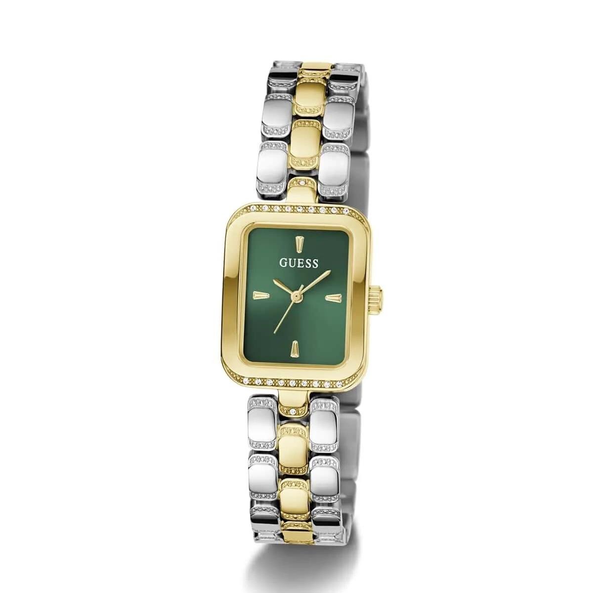 Guess Isla modeli, ince detayları ve zarif tasarımıyla klasik stilin modern yorumunu sunuyor. Altın renkli çelik kasası, yeşil kadranı ve iki tonlu bileziğiyle Isla, her bakışta sofistike bir duruş sergiler.