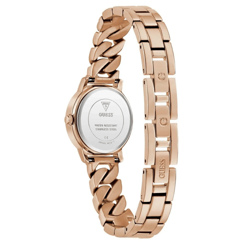 Guess Chime Kadın Kol Saati, model Chime, cinsiyet Kadın, mekanizma Quartz, garanti 2 Yıl, marka Guess, kasa çapı 25 mm, kasa kalınlık 8 mm, kasa materyali Çelik, kasa renk Rose Gold, kasa şekli Yuvarlak, cam özellik Mineral, kasa taşı Yok, tarz Klasik Saatler, kadran tipi Analog, kadran taşı Yok, kadran ışık Yok, kadran renk Rose Gold, kordon özellik Çelik, kordon rengi Rose Gold, kordon uzunluğu 19 cm, kordon genişliği 12 mm, kronometre Yok, su geçirmezlik 3 ATM, alarm Yok, takvim Yok şeklindeki teknik özelliklere sahiptir.