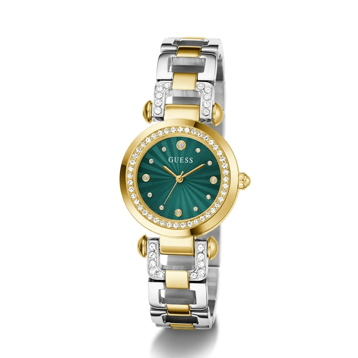 Zarif ve göz alıcı tasarımıyla öne çıkan Guess Ginger Kadın Saat, abiye şıklığını tamamlayan ışıltılı detaylarıyla dikkat çekiyor. Güvenilir Quartz mekanizması ile donatılan bu model, 2 yıl garanti güvencesiyle sunuluyor. Altın rengi çelik kasası (30 mm çap, 8 mm kalınlık) ve üzerindeki taş detayları, saatin lüks görünümünü ön plana çıkarıyor. Dayanıklı mineral camı, uzun ömürlü kullanım sağlarken, sofistike bir dokunuş katan yeşil taşlı analog kadranı şıklığıyla göz kamaştırıyor. Altın rengi ve metalik gri çelik kordonu (19 cm uzunluk, 15 mm genişlik) bileğe zarif bir uyum sağlarken, modern bir kontrast oluşturuyor. Günlük şıklığın yanı sıra özel davetlerde de öne çıkan bu model, 3 ATM su geçirmezlik özelliğiyle sıçramalara karşı dayanıklıdır. Estetik ve zarafeti bir arada sunan bu saat, stiline ışıltılı bir dokunuş katmak isteyen kadınlar için mükemmel bir tercihtir.