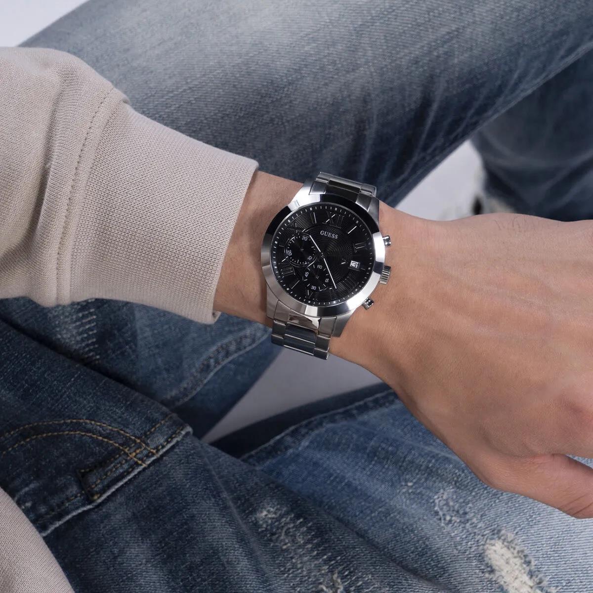 Guess Atlas saati, metalik gri çelik kasa ve 45 mm kasa çapı ile dikkat çeker. Siyah kadran tasarımı ve 12 mm kasa kalınlığı ile şıklığı ve zarafeti bir araya getirir. Kronometre ve takvim fonksiyonlarıyla günlük hayatta size kolaylık sağlar.