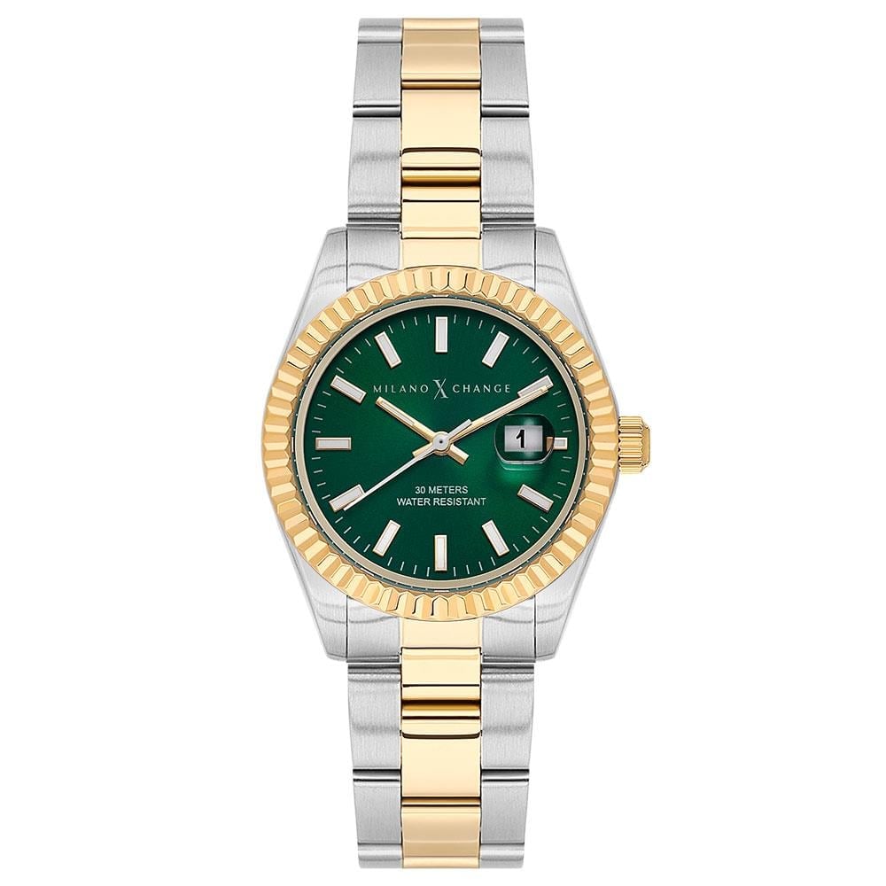 Modern ve zarif tasarımıyla öne çıkan Milano X Change MXL6125, yeşil kadranı ve altın sarısı ile metalik renklerdeki kasa ve kordonuyla göz alıcı bir görünüm sunuyor. 34 mm kasa çapı, hem günlük hem de özel kullanım için ideal bir uyum sağlar. 50 metre su geçirmezlik özelliği, saatinizi her koşulda güvenle kullanmanıza olanak tanır.