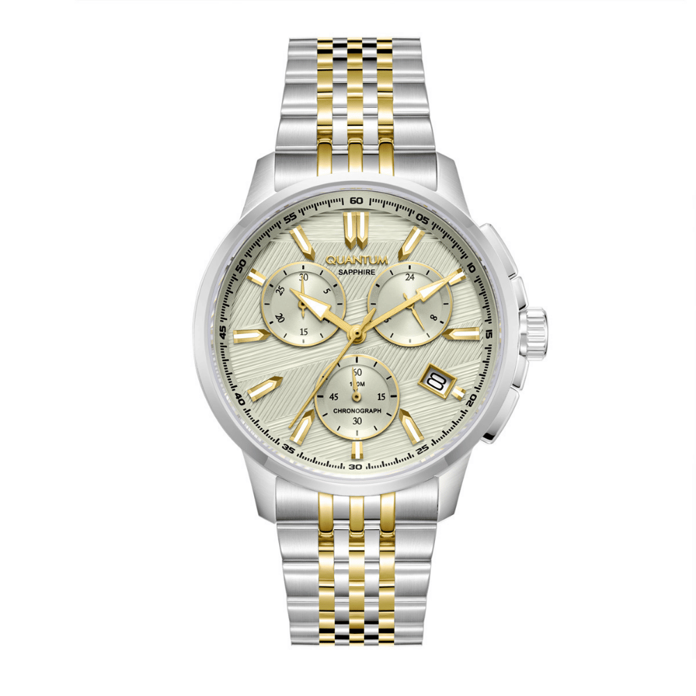 Quantum markasının üstün saatçilik anlayışıyla tasarlanan bu erkek kol saati, şıklık ve dayanıklılığı bir arada sunuyor. 44 mm paslanmaz çelik kasa, sağlam yapısıyla güçlü bir görünüm sunarken, metalik gri-altın paslanmaz çelik kordonu ile modern çizgileri yansıtır. Quantum’un kalite anlayışını yansıtan modelde kullanılan safir cam, çizilmelere karşı üst düzey dayanıklılık sağlar. Analog ekran tipi klasik ve net bir okuma sunarken, Quartz mekanizma sayesinde yüksek hassasiyetle çalışır. 10 ATM su geçirmezlik, günlük kullanım ve su temaslarına karşı yeterli koruma sağlarken; kronometre ve takvim fonksiyonları aktif yaşamı destekleyen pratik özellikler sunar. Quantum kalitesi, bu modeli sadece bir saat değil, aynı zamanda zamana karşı sağlam bir duruş haline getiriyor.