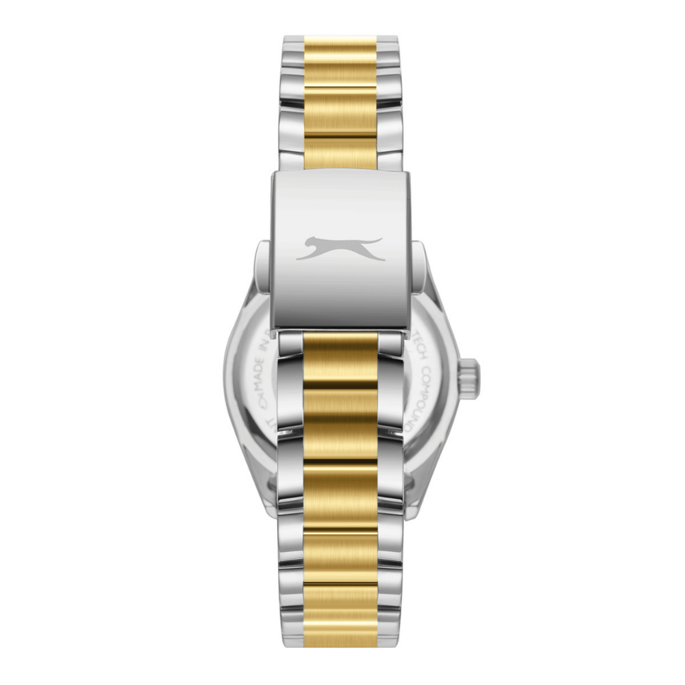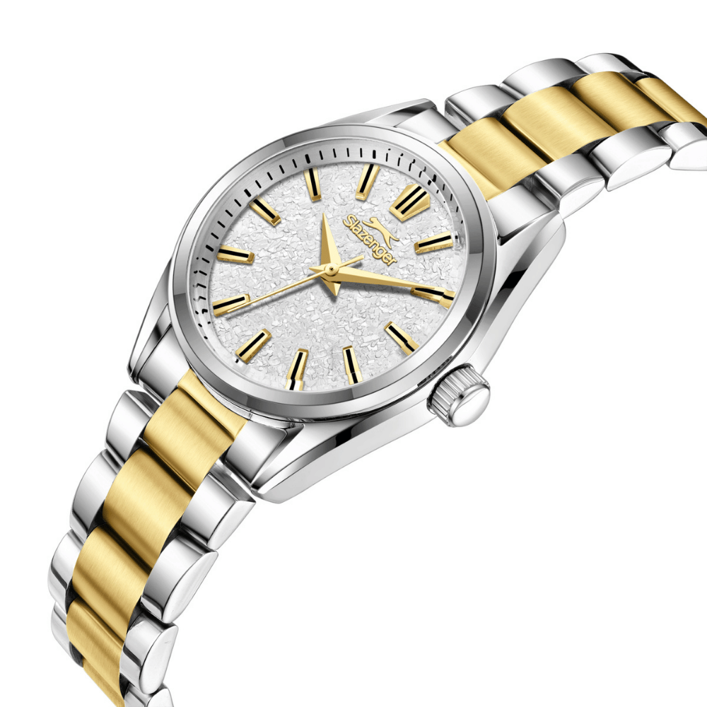 Slazenger markasının zarif detaylarla tasarlanmış bu kadın kol saati,30 mm çapında paslanmaz çelik kasa ile hem dayanıklılığı hem de estetik görünümü bir arada sunar.Metalik gri-altın renkli paslanmaz çelik kordon,bilekte zarafetle parlayarak her stile sofistike bir dokunuş kazandırır.Metalik gri kasa rengi,saatin modern duruşunu güçlendirirken,göz alıcı uyumuyla dikkat çeker.Beyaz kadran rengi,sade ve zarif bir ifade sunarken,ışıltılı tonuyla zaman kavramına şıklık katar.Mineral cam,günlük kullanıma uygun dayanıklılık sağlayarak çizilmelere karşı koruma sunar.Analog ekran tipi,klasik tarzı benimseyen kullanıcılar için ideal bir görünüm sağlarken,Quartz mekanizma,zamanı daima doğru ve güvenilir bir şekilde sunar.5 ATM su geçirmezlik seviyesi,el yıkama,yağmur gibi gündelik su temaslarına karşı koruma sağlar.Minimal tasarımı,göz alıcı renk geçişleri ve zamansız çizgileriyle öne çıkan bu model,hem günlük kombinlerinize uyum sağlar hem de özel anlarınızda zarif bir tamamlayıcı olur.Şıklığı ve fonksiyonelliği bir arada sunan bu saat,detaylara önem veren stil sahibi kadınlar için mükemmel bir seçimdir.
