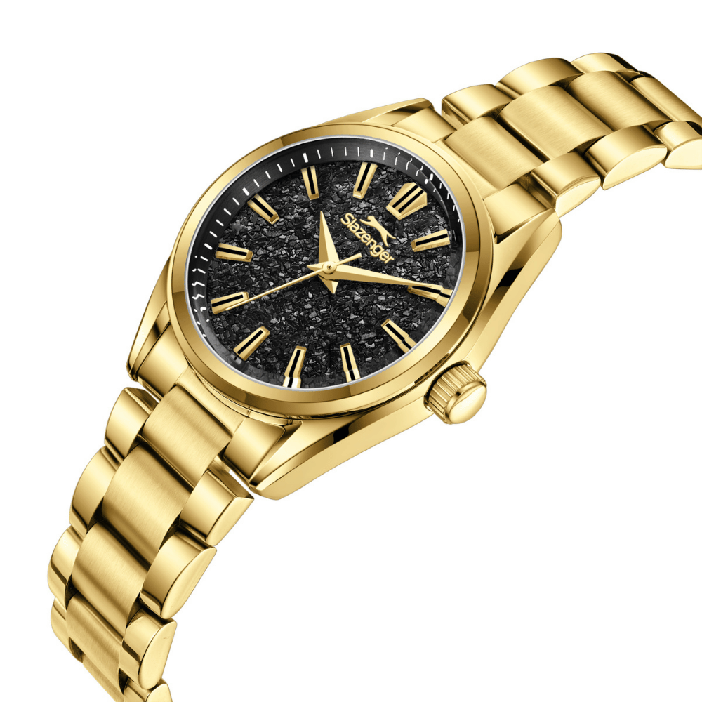 Slazenger markasının zarif detaylarla tasarlanmış bu kadın kol saati,30 mm çapında paslanmaz çelik kasa ile hem dayanıklılığı hem de estetik görünümü bir arada sunar.Altın renkli paslanmaz çelik kordon,bilekte zarafetle parlayarak her stile sofistike bir dokunuş kazandırır.Altın kasa rengi,saatin modern duruşunu güçlendirirken,göz alıcı uyumuyla dikkat çeker.Siyah kadran rengi,sade ve zarif bir ifade sunarken,ışıltılı tonuyla zaman kavramına şıklık katar.Mineral cam,günlük kullanıma uygun dayanıklılık sağlayarak çizilmelere karşı koruma sunar.Analog ekran tipi,klasik tarzı benimseyen kullanıcılar için ideal bir görünüm sağlarken,Quartz mekanizma,zamanı daima doğru ve güvenilir bir şekilde sunar.5 ATM su geçirmezlik seviyesi,el yıkama,yağmur gibi gündelik su temaslarına karşı koruma sağlar.Minimal tasarımı,göz alıcı renk geçişleri ve zamansız çizgileriyle öne çıkan bu model,hem günlük kombinlerinize uyum sağlar hem de özel anlarınızda zarif bir tamamlayıcı olur.Şıklığı ve fonksiyonelliği bir arada sunan bu saat,detaylara önem veren stil sahibi kadınlar için mükemmel bir seçimdir.