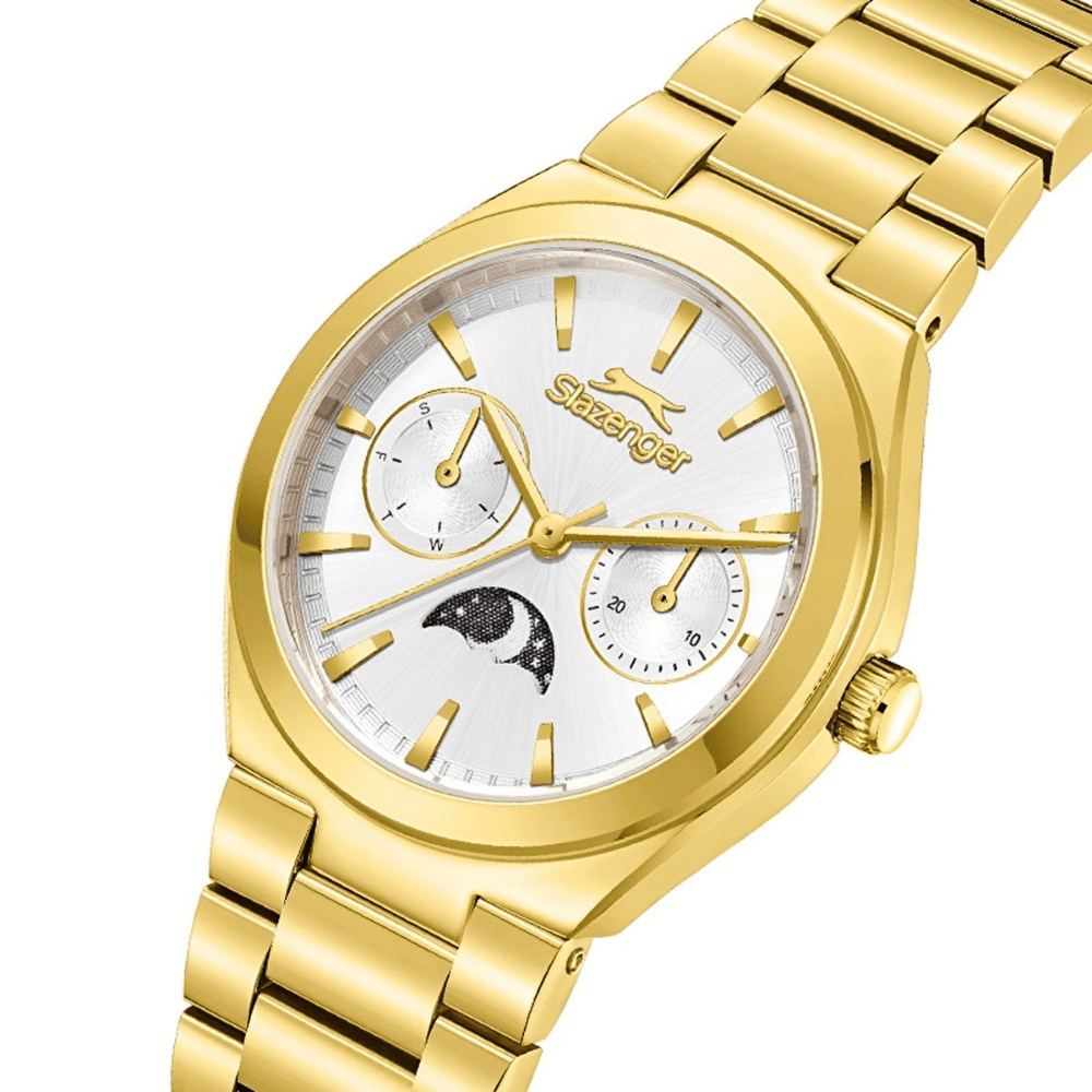 Slazenger markasının zarif detaylarla tasarlanmış bu kadın kol saati,34 mm çapında paslanmaz çelik kasa ile hem dayanıklılığı hem de estetik görünümü bir arada sunar.Altın renkli paslanmaz çelik kordon,bilekte zarafetle parlayarak her stile sofistike bir dokunuş kazandırır.altın kasa rengi,saatin modern duruşunu güçlendirirken,göz alıcı uyumuyla dikkat çeker.Gümüş kadran rengi,sade ve zarif bir ifade sunarken,ışıltılı tonuyla zaman kavramına şıklık katar.Mineral cam,günlük kullanıma uygun dayanıklılık sağlayarak çizilmelere karşı koruma sunar.Analog ekran tipi,klasik tarzı benimseyen kullanıcılar için ideal bir görünüm sağlarken,Quartz mekanizma,zamanı daima doğru ve güvenilir bir şekilde sunar.5 ATM su geçirmezlik seviyesi,el yıkama,yağmur gibi gündelik su temaslarına karşı koruma sağlar.Minimal tasarımı,göz alıcı renk geçişleri ve zamansız çizgileriyle öne çıkan bu model,hem günlük kombinlerinize uyum sağlar hem de özel anlarınızda zarif bir tamamlayıcı olur.Şıklığı ve fonksiyonelliği bir arada sunan bu saat,detaylara önem veren stil sahibi kadınlar için mükemmel bir seçimdir.