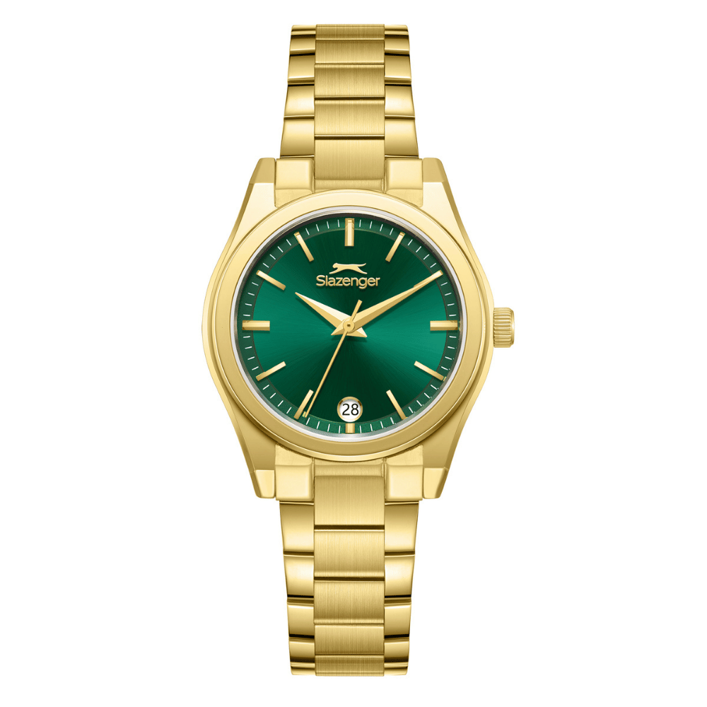Slazenger markasının zarif detaylarla tasarlanmış bu kadın kol saati,32 mm çapında paslanmaz çelik kasa ile hem dayanıklılığı hem de estetik görünümü bir arada sunar.Altın renkli paslanmaz çelik kordon,bilekte zarafetle parlayarak her stile sofistike bir dokunuş kazandırır.Altın kasa rengi,saatin modern duruşunu güçlendirirken,göz alıcı uyumuyla dikkat çeker.Yeşil kadran rengi,sade ve zarif bir ifade sunarken,ışıltılı tonuyla zaman kavramına şıklık katar.Mineral cam,günlük kullanıma uygun dayanıklılık sağlayarak çizilmelere karşı koruma sunar.Analog ekran tipi,klasik tarzı benimseyen kullanıcılar için ideal bir görünüm sağlarken,Quartz mekanizma,zamanı daima doğru ve güvenilir bir şekilde sunar.5 ATM su geçirmezlik seviyesi,el yıkama,yağmur gibi gündelik su temaslarına karşı koruma sağlar.Minimal tasarımı,göz alıcı renk geçişleri ve zamansız çizgileriyle öne çıkan bu model,hem günlük kombinlerinize uyum sağlar hem de özel anlarınızda zarif bir tamamlayıcı olur.Şıklığı ve fonksiyonelliği bir arada sunan bu saat,detaylara önem veren stil sahibi kadınlar için mükemmel bir seçimdir.