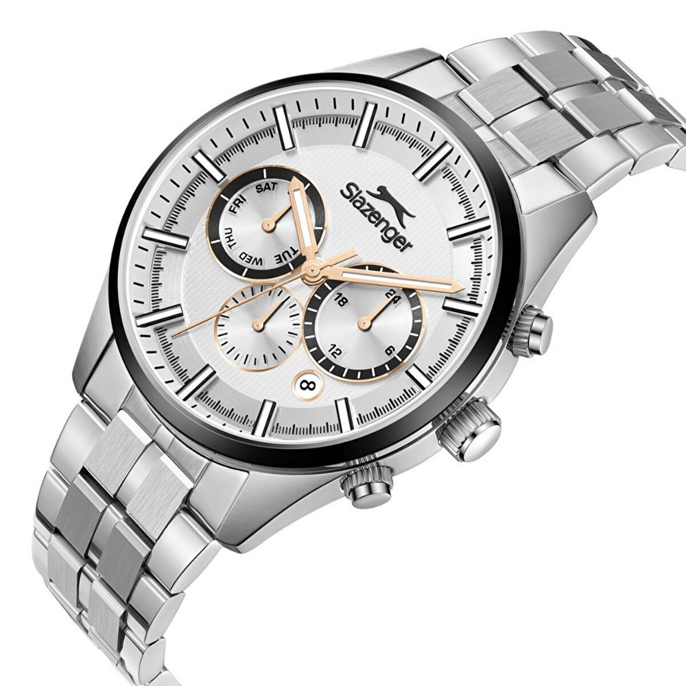 Zamansız bir stil ve güçlü bir duruş arayan erkekler için tasarlanan Slazenger Erkek Kol Saati,hem estetik hem de fonksiyonel özellikleriyle öne çıkıyor.41 mm çapındaki yuvarlak çelik kasa,gümüş tonuyla modern ve klasik tarzı mükemmel bir şekilde birleştiriyor.12 mm kalınlığa sahip kasa,bilekte şık ve dengeli bir görünüm sunuyor.Beyaz analog kadran,güçlü kontrastıyla okunabilirliği artırırken;takvim ve 24 saat göstergesi gibi fonksiyonlarıyla da günlük yaşamda pratiklik sağlıyor.Quartz (pilli) mekanizma,zamanın her anında hassasiyet sunarken;mineral cam,çizilmelere karşı dayanıklılık sağlayarak uzun ömürlü kullanım imkanı veriyor.Gümüş renkli çelik kordon,dayanıklılığı şıklıkla buluşturuyor.10 ATM su geçirmezlik seviyesi sayesinde yağmurlu günlerde ya da el yıkama gibi günlük temaslarda gönül rahatlığıyla kullanılabilir.2 yıl garanti ile gelen bu model,Slazenger kalitesini her detayında hissettiren özel bir aksesuardır.Tarzına değer veren erkekler için vazgeçilmez bir seçim.