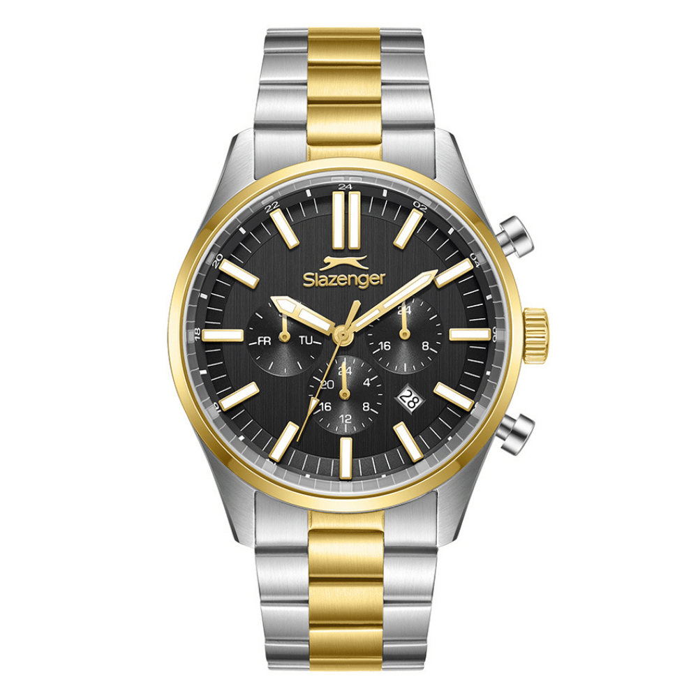 Şıklığı ve işlevselliği bir arada sunan bu erkek kol saati, 44 mm çapında geniş bir yapıya ve dayanıklı paslanmaz çelik kasaya sahiptir. Metalik gri ve altın renkli paslanmaz çelik kordon ise saate modern ve güçlü bir görünüm kazandırır. Mineral cam yapısı günlük kullanımda çizilmelere karşı dayanıklılık sağlarken, klasik analog ekran şıklığı tamamlar. Saatin içerisinde yer alan Quartz mekanizma, zamanı hassas bir şekilde ölçer. 5 ATM su geçirmezlik özelliği ile su sıçramalarına karşı koruma sağlar. Ayrıca modelde takvim fonksiyonları da bulunmakta olup, günlük hayatın temposuna ayak uydurmanızı kolaylaştırır. Alarm fonksiyonu bulunmamaktadır.