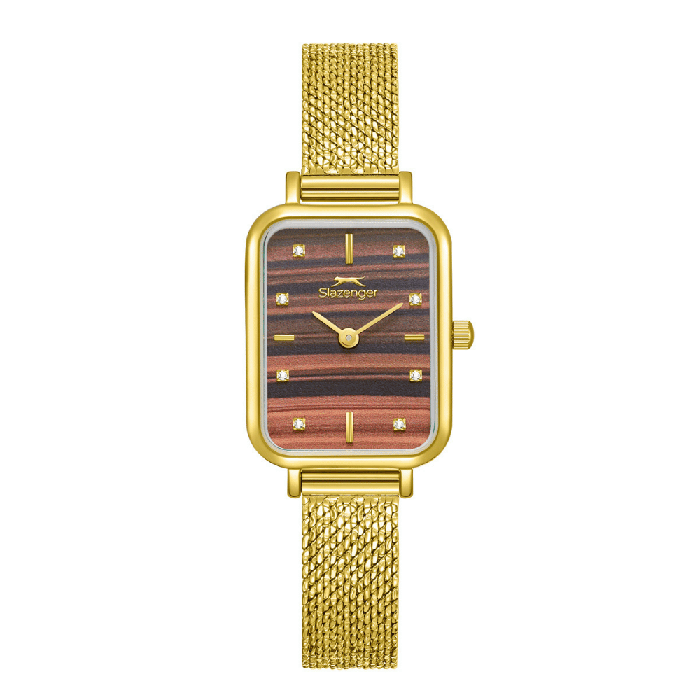 Slazenger markasının zarif detaylarla tasarlanmış bu kadın kol saati, 20 mm çapında paslanmaz çelik kasa ile hem dayanıklılığı hem de estetik görünümü bir arada sunar.Altın renkli paslanmaz çelik hasır kordon,bilekte zarafetle parlayarak her stile sofistike bir dokunuş kazandırır.Altın kasa rengi,saatin modern duruşunu güçlendirirken,göz alıcı uyumuyla dikkat çeker.Kahve kadran rengi,sade ve zarif bir ifade sunarken,ışıltılı tonuyla zaman kavramına şıklık katar.Mineral cam,günlük kullanıma uygun dayanıklılık sağlayarak çizilmelere karşı koruma sunar.Analog ekran tipi,klasik tarzı benimseyen kullanıcılar için ideal bir görünüm sağlarken,Quartz mekanizma,zamanı daima doğru ve güvenilir bir şekilde sunar.5 ATM su geçirmezlik seviyesi,el yıkama,yağmur gibi gündelik su temaslarına karşı koruma sağlar.Minimal tasarımı,göz alıcı renk geçişleri ve zamansız çizgileriyle öne çıkan bu model,hem günlük kombinlerinize uyum sağlar hem de özel anlarınızda zarif bir tamamlayıcı olur.Şıklığı ve fonksiyonelliği bir arada sunan bu saat,detaylara önem veren stil sahibi kadınlar için mükemmel bir seçimdir.