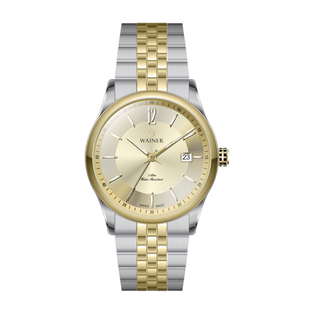 Wainer marka bu şık kol saati, İsviçre menşeli Quartz mekanizması ile hassas zaman tutuşu sunar. 40 mm çapında ve yalnızca 7,85 mm kalınlığındaki paslanmaz çelik kasası, modern bir görünüm sağlarken, seramik safir kaplamalı camı çizilmelere karşı ekstra dayanıklılık kazandırır. Altın kadranı ve silver-altın renkli kasa-kordon uyumu, zarif bir stil sunar. Takvim fonksiyonu, günlük kullanım kolaylığı sağlarken, 5 ATM su geçirmezlik özelliğiyle sıçramalara karşı koruma sağlar. Saat, ayrıca 2 yıl garantilidir.