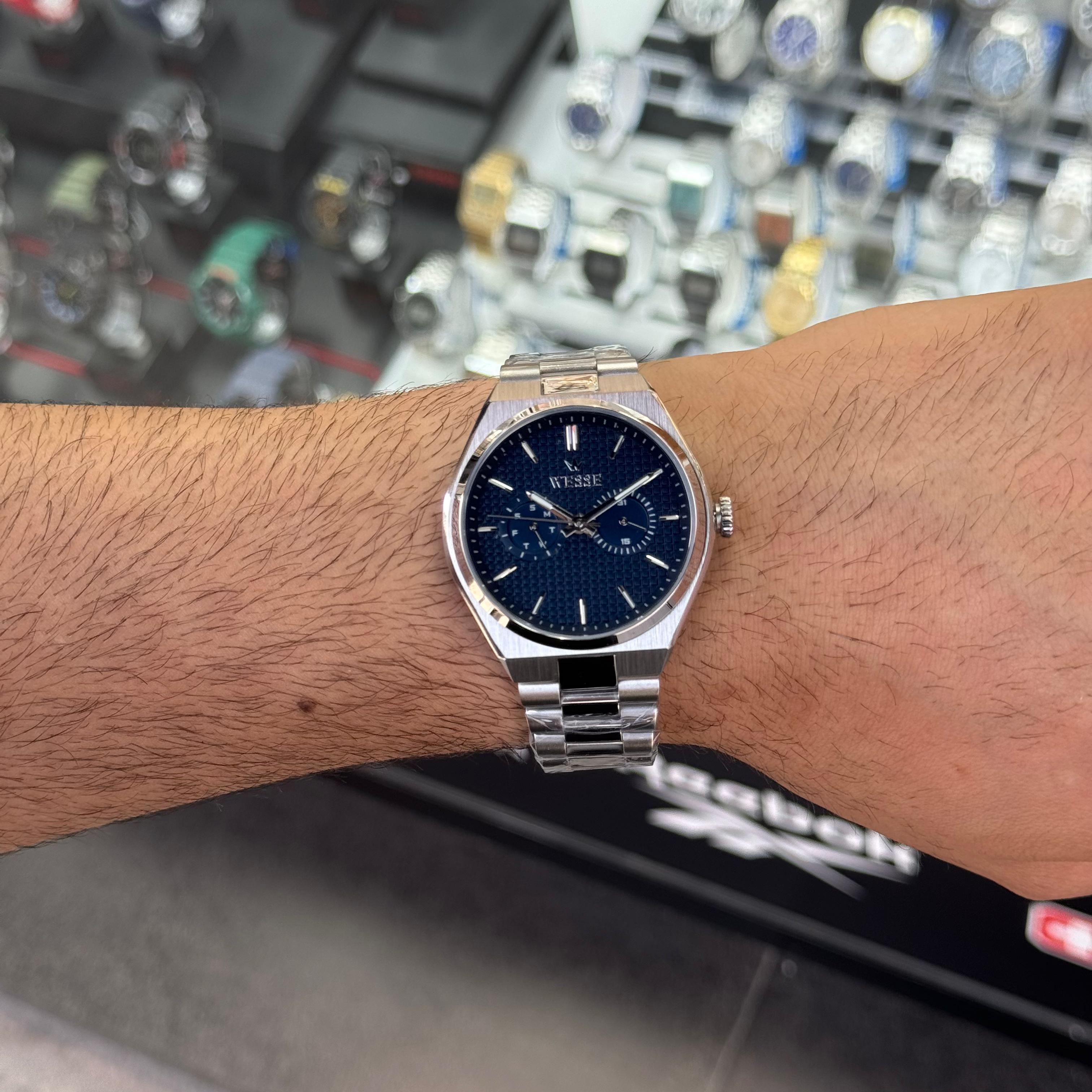 Bu Wesse erkek kol saati, Quartz mekanizması, 2 yıl garantisi ve 120 gram ağırlığıyla sağlam ve zarif bir kullanım sunar. 42 mm çapında, 10 mm kalınlığındaki yuvarlak çelik kasa, metalik gri rengiyle klasik şıklığı yansıtır. Mineral camı dayanıklılığı artırırken, mavi renkli analog kadranı dikkat çekici bir görünüm sağlar. Metalik gri çelik kordonu, 22 x 18 mm genişliği ve 20 cm uzunluğuyla bileğe mükemmel uyum sağlar. Saat, 5 ATM su geçirmezlik özelliğiyle günlük kullanım için uygundur ve gün takvimi fonksiyonuna sahiptir. Alarm ve kronometre özellikleri bulunmamaktadır. Klasik ve zamansız tasarımıyla bu model, şıklığı ve fonksiyonelliği bir arada arayan erkekler için ideal bir tercihtir.