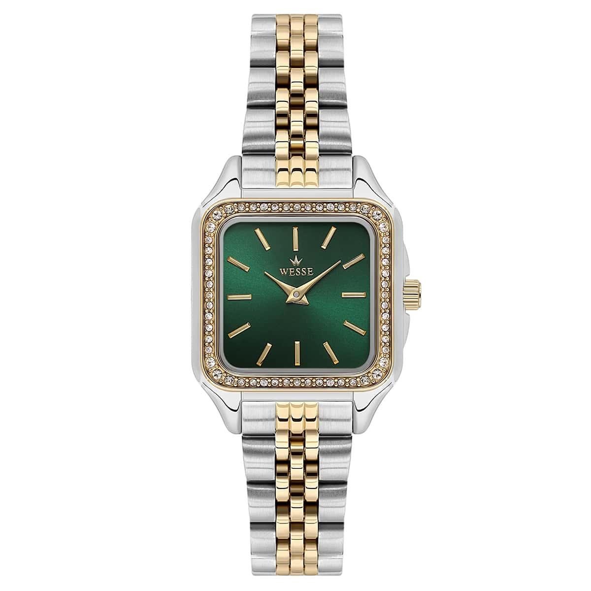 Wesse kadın kol saati, Quartz mekanizma, 2 yıl garanti ve 58 gram ağırlık ile kullanıma sunulmaktadır. 27 x 35.5 mm boyutlarında, 8 mm kalınlığında metalik gri çelik kasa, zarif dikdörtgen şekli ve kasa taşı detayıyla şıklığı artırır. Saat, dayanıklı mineral cam ile korunur. Canlı yeşil analog kadranı sade ve estetik bir görünüm sunar. Altın rengi ve metalik gri tonlarında çelik kordonu, 19 cm uzunluğunda ve 12 x 14 mm genişliğinde tasarlanmıştır. Günlük kullanıma uygun olarak 3 ATM su geçirmezlik özelliği bulunur; alarm, kronometre ve takvim fonksiyonları yoktur. Klasik tarzıyla her ortamda zarafet katan bir saat modelidir.