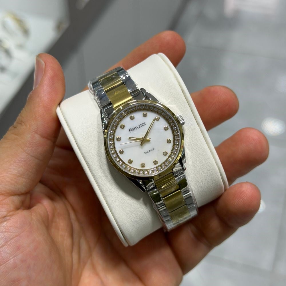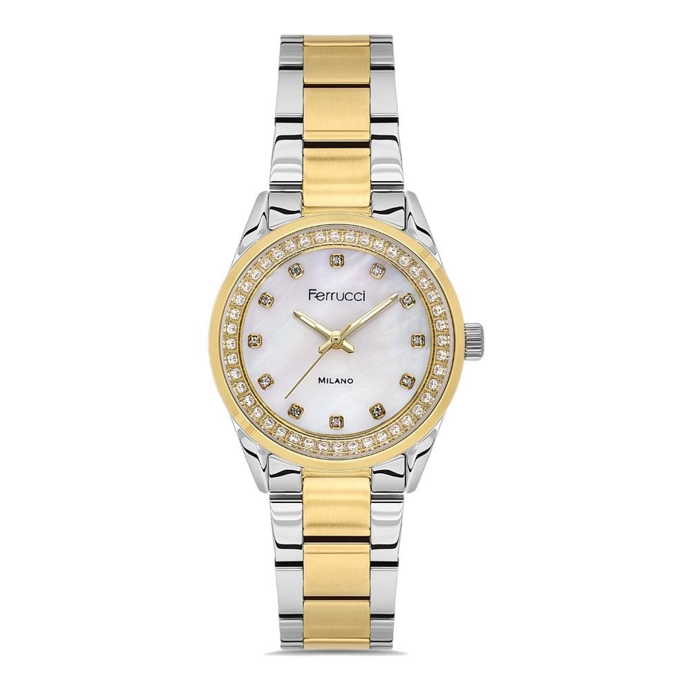 Ferrucci kadın kol saati, çelik, i̇ki renk kasa ve 30 mm kasa çapıyla bileğe feminen ve modern bir dokunuş katar. quartz mekanizma ve mineral cam ile donatılan model, uzun süreli kullanımda güvenilirdir. 3 ATM su geçirmezlik değeri ekstra koruma sağlar. çelik kordon, i̇ki renk ise seçimi şıklığa işlevsellik katarken 2 Yıl garanti ile satış sonrası destek de tamam. şık çizgileri ve kaliteli detaylarıyla koleksiyonunuzun vazgeçilmezi olacaktır.