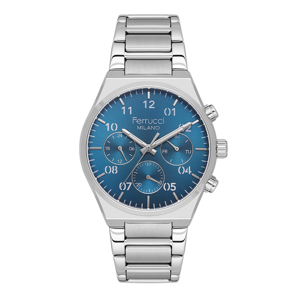 Sağlam yapısı ve kararlı duruşuyla Ferrucci imzalı bu erkek kol saatinde çelik, metalik gri kasa kullanılmıştır. 43 mm kasa çapı bileğe baskın ve güçlü bir görünüm sunarken quartz mekanizma, mineral cam ile birlikte uzun süreli güvenilirlik sağlar. 3 ATM su geçirmezlik değeriyle aktif kullanımda da güvenle tercih edilebilir. çelik kordon, metalik gri ise ile tamamlanan tasarım, 2 Yıl garanti güvencesiyle birlikte hem günlük kullanımda hem de özel anlarda güvenle tercih edilebilecek bir erkek saatidir.