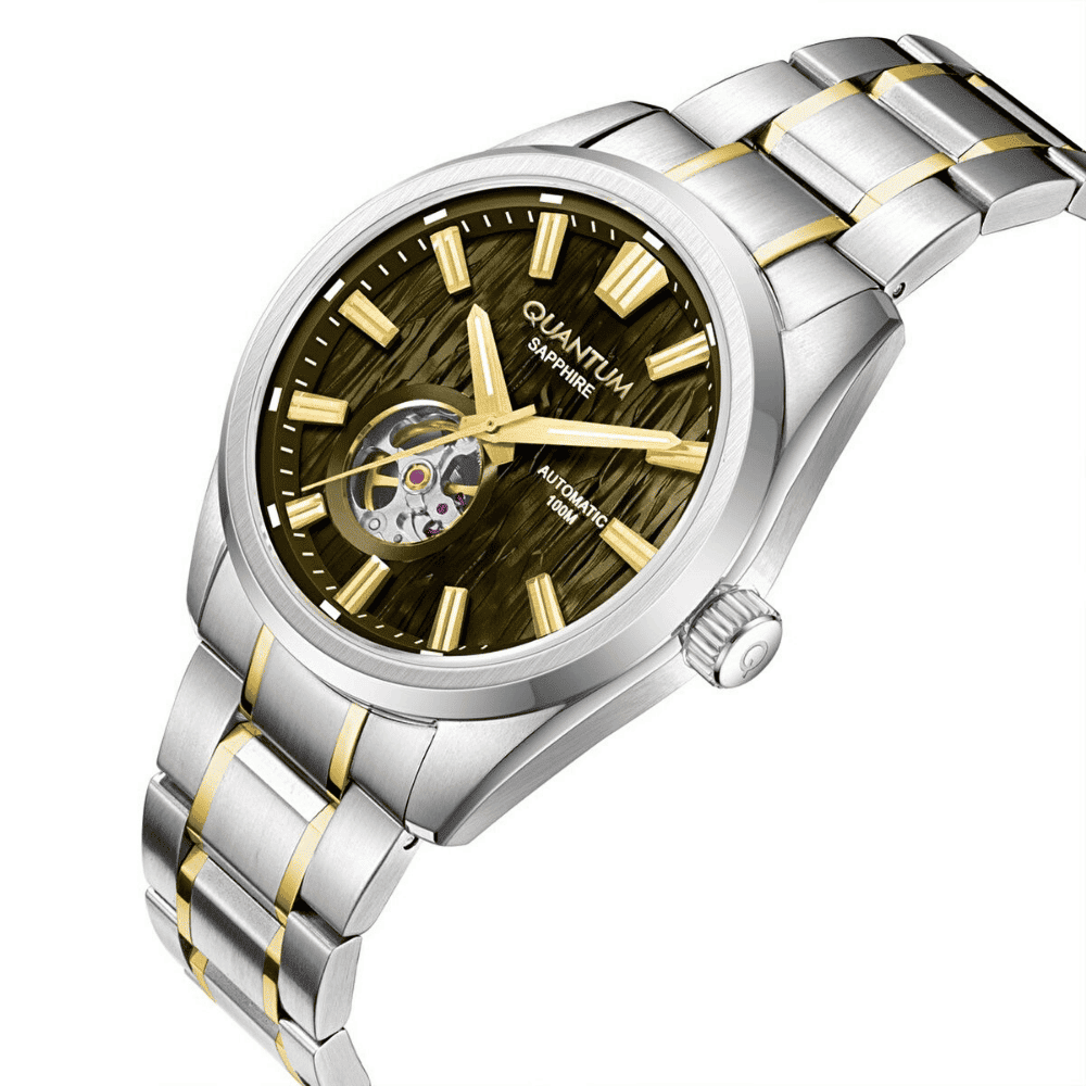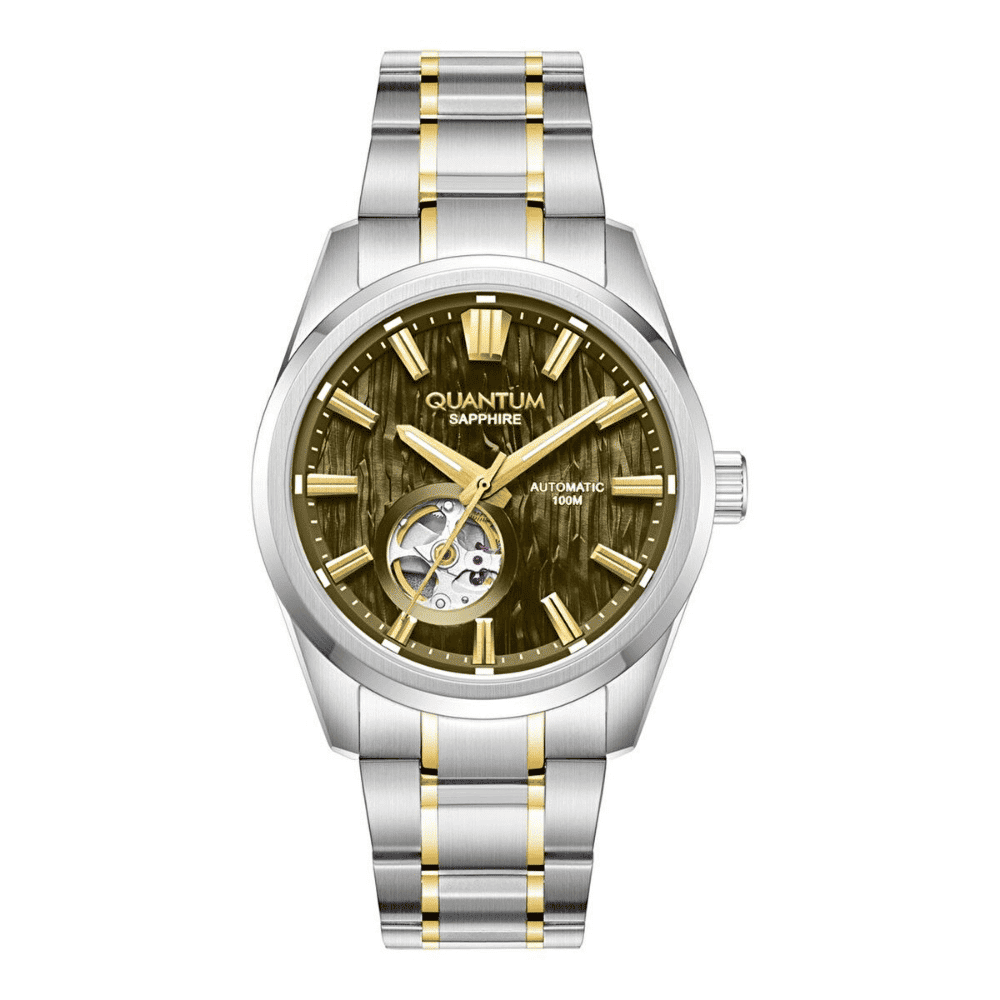 Zarif siyah kadranı ve dikkat çekici tasarımıyla öne çıkan Quantum otomatik kol saati, modern stilin güçlü ve sade bir yansımasıdır. 41 mm kasa çapı ile bilekte dengeli ve iddialı bir duruş sunan bu model, günlük kullanımda hem şıklığı hem de sağlamlığı bir arada sunar. Paslanmaz çelik kasa ve gri-altın renkli çelik bilezik, saatin sofistike ve zamansız çizgilerini tamamlar. Safir cam, çizilmelere karşı yüksek dayanıklılık sağlarken, yansıma önleyici kaplama ile her açıdan net bir görüş imkânı sunar. Yeşil kadranı, yalın ve şık detaylarıyla dikkat çekerken, sade tasarımıyla hem klasik hem de modern giyim stilleriyle uyum sağlar. Otomatik mekanizması, kol hareketiyle kendini sararak pile ihtiyaç duymadan enerji üretir. 10 ATM (100 metre) su geçirmezlik seviyesi, günlük su temaslarına ve yüzmeye karşı güvenli kullanım sunar. Şıklık, dayanıklılık ve teknik üstünlüğü bir araya getiren Quantum otomatik saat, stil sahibi kullanıcılar için ideal bir tercihtir.