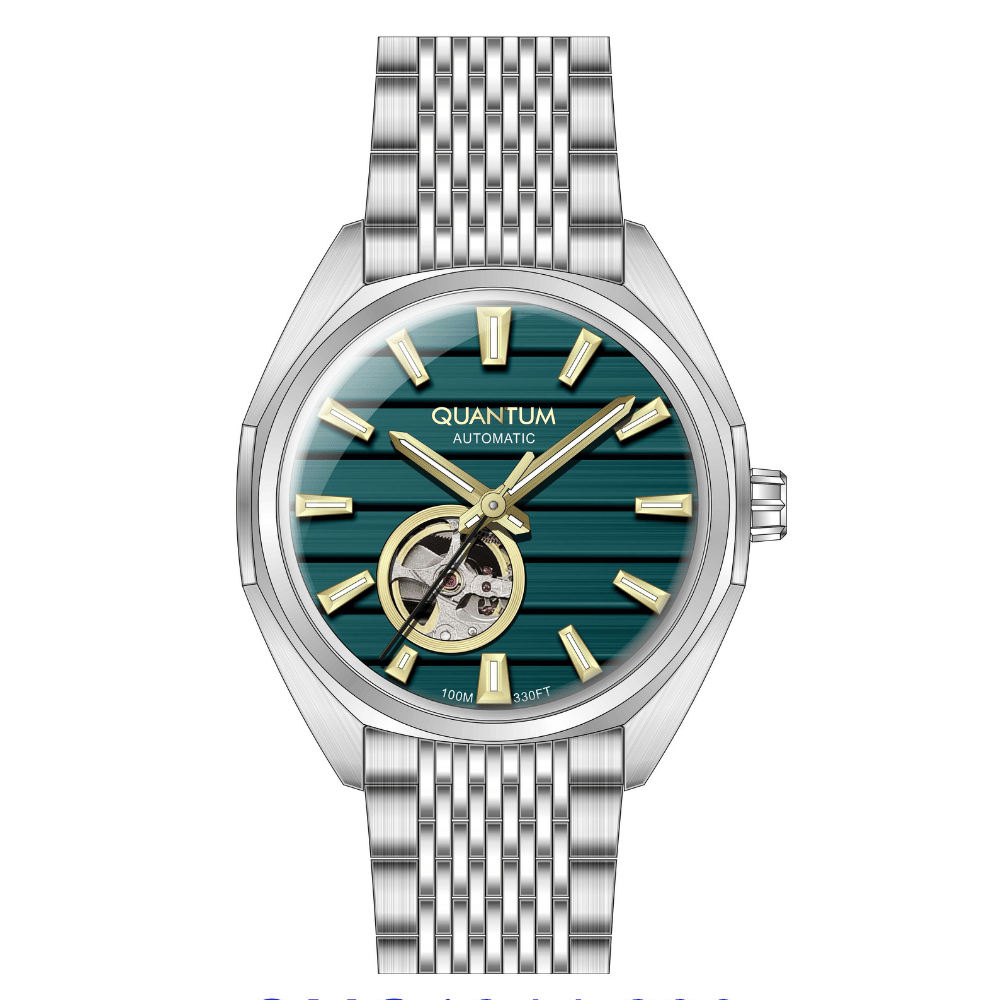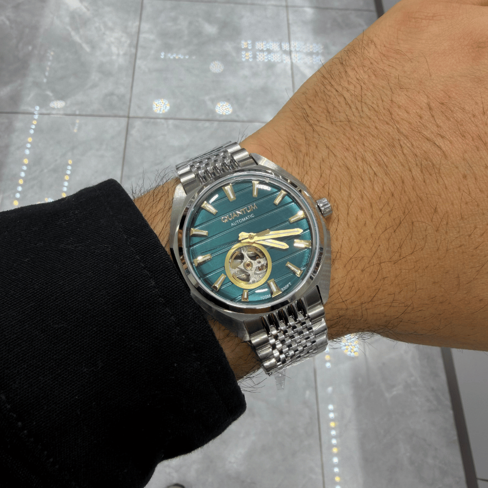 Zarif siyah kadranı ve dikkat çekici tasarımıyla öne çıkan Quantum otomatik kol saati, modern stilin güçlü ve sade bir yansımasıdır. 41 mm kasa çapı ile bilekte dengeli ve iddialı bir duruş sunan bu model, günlük kullanımda hem şıklığı hem de sağlamlığı bir arada sunar. Paslanmaz çelik kasa ve gri renkli çelik bilezik, saatin sofistike ve zamansız çizgilerini tamamlar. Mineral cam, çizilmelere karşı yüksek dayanıklılık sağlarken, yansıma önleyici kaplama ile her açıdan net bir görüş imkânı sunar. Yeşil kadranı, yalın ve şık detaylarıyla dikkat çekerken, sade tasarımıyla hem klasik hem de modern giyim stilleriyle uyum sağlar. Otomatik mekanizması, kol hareketiyle kendini sararak pile ihtiyaç duymadan enerji üretir. 10 ATM (100 metre) su geçirmezlik seviyesi, günlük su temaslarına ve yüzmeye karşı güvenli kullanım sunar. Şıklık, dayanıklılık ve teknik üstünlüğü bir araya getiren Quantum otomatik saat, stil sahibi kullanıcılar için ideal bir tercihtir.