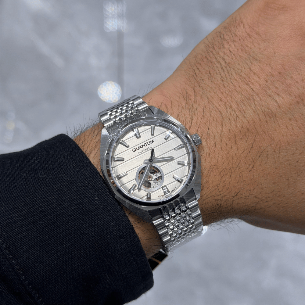 Zarif siyah kadranı ve dikkat çekici tasarımıyla öne çıkan Quantum otomatik kol saati, modern stilin güçlü ve sade bir yansımasıdır. 41 mm kasa çapı ile bilekte dengeli ve iddialı bir duruş sunan bu model, günlük kullanımda hem şıklığı hem de sağlamlığı bir arada sunar. Paslanmaz çelik kasa ve gri renkli çelik bilezik, saatin sofistike ve zamansız çizgilerini tamamlar. Mineral cam, çizilmelere karşı yüksek dayanıklılık sağlarken, yansıma önleyici kaplama ile her açıdan net bir görüş imkânı sunar. Gri kadranı, yalın ve şık detaylarıyla dikkat çekerken, sade tasarımıyla hem klasik hem de modern giyim stilleriyle uyum sağlar. Otomatik mekanizması, kol hareketiyle kendini sararak pile ihtiyaç duymadan enerji üretir. 10 ATM (100 metre) su geçirmezlik seviyesi, günlük su temaslarına ve yüzmeye karşı güvenli kullanım sunar. Şıklık, dayanıklılık ve teknik üstünlüğü bir araya getiren Quantum otomatik saat, stil sahibi kullanıcılar için ideal bir tercihtir.